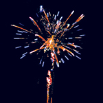 Золотая комета взлетает с громким треском и разрывается разноцветными сферами с трещащими искристыми хвостами.