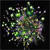 Разноцветные кометы разрываются сферами из: белых мерцающих и красных огней с искристыми форсами; зеленых и фиолетовых огней.
