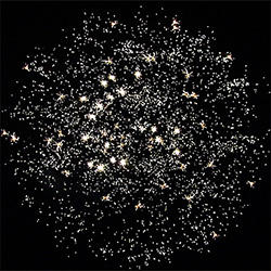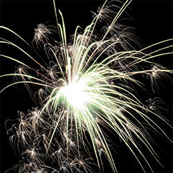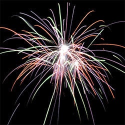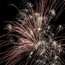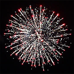 3 эффекта. Разноцветные кометы разрываются сферами из: серебряных форсов с красными огнями на концах и серебряных мерцающих огней, красных и трещащих огней, золотых форсов и множества трещащих сфер.