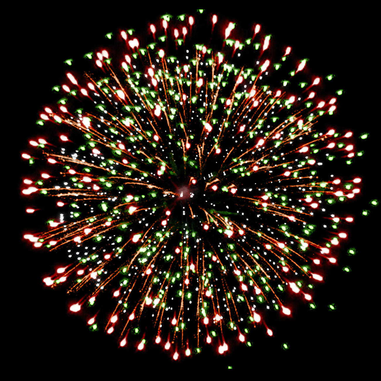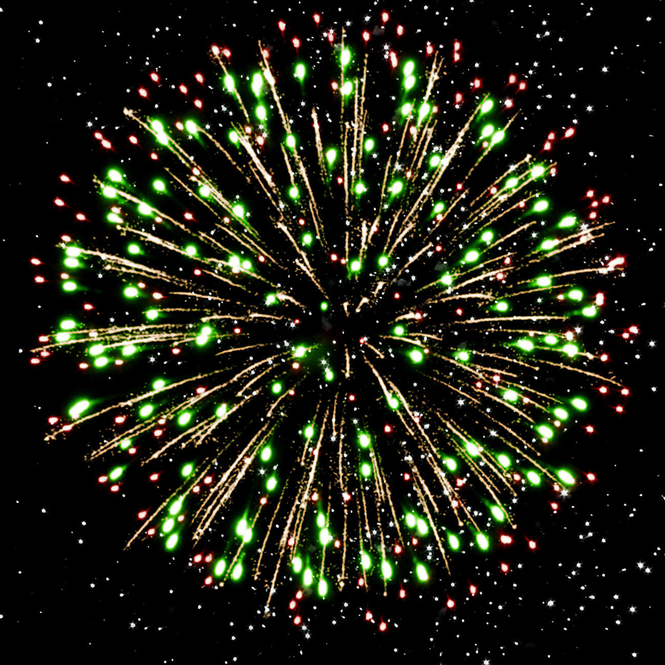 24. Сферы из красных, зеленых огней и множества серебряных трещащих искр.