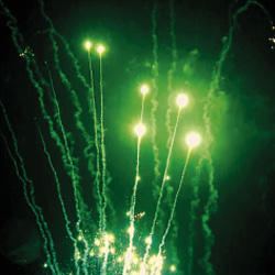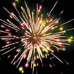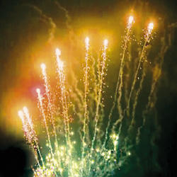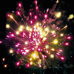 2. Выстреливает подряд: Множество серебряных ниспадающих нитей (парча) и фиолетово- желтые звезды Красно- зеленые звезды с пышными хвостами (кокос) и треск 3-