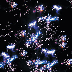 13. ЗАЛП: Хаотично разлетающиеся серебряные огоньки (мошки) и синие звезды