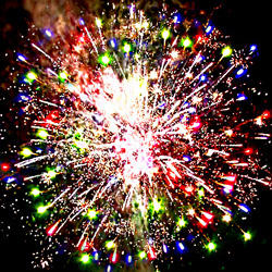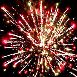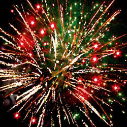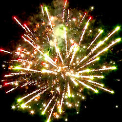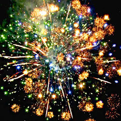 9-10. Выстреливает ЗАЛП: Кометы с трещащими хвостами разрываются в облако треска (трещащая хризантема) Множество серебряных ниспадающих нитей (парча) и красно- зелено- синяя сфера (пион)