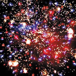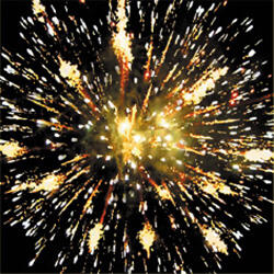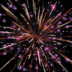 4. Сине-красная сфера (пион) и облако золотого треска (трещащая хризантема).