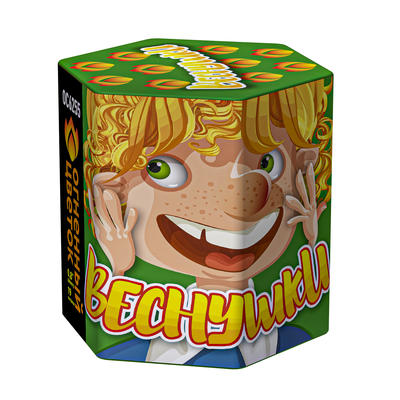 5 эффектов. Разноцветные кометы, искристые трассы разрываются сферами из: красных и белых мерцающих огней, красных и зеленых мерцающих огней, красных огней с серебряными форсами, зеленых огней с серебряными форсами, множества серебряных разлетающихся трещащих искр.
