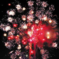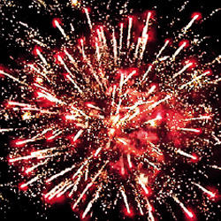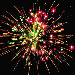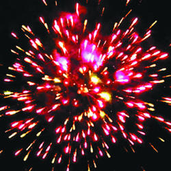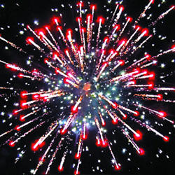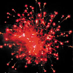 5. Свистящая комета (змейка) разрывается красно-белой мерцающей сферой (пион) и облаком трещащих разрывов (трещащая хризантема).