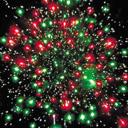 Красные кометы разрываются на пионы с крупным синим, зеленым, красным и пурпурным жемчугом. Парчовая пальма с яркими синими и зелеными звездами переходящая в цветную трещащую хризантему. Яркий совокупный финал.