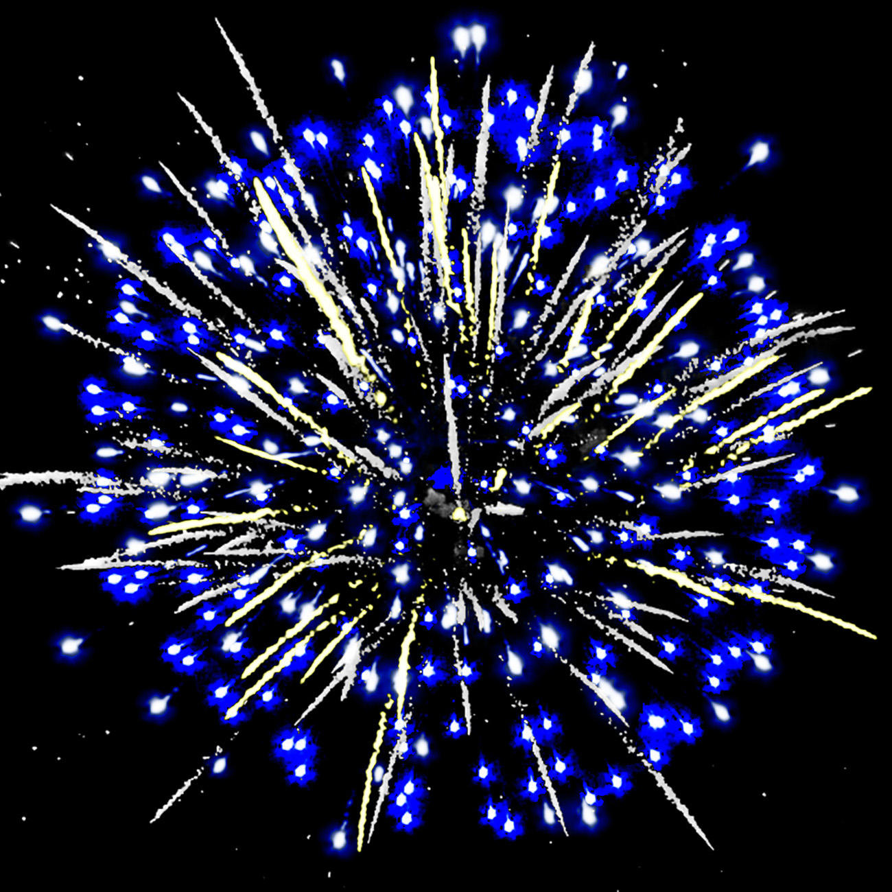 5. Сине- красная мерцающая сфера (пион) и облако золотого треска (трещащий дождь).