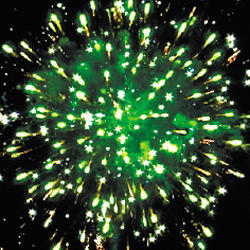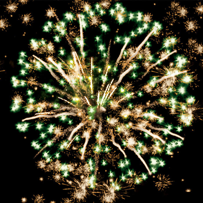 4. Финальный залп: Зеленые звезды с пышными хвостами (кокос) и треск
