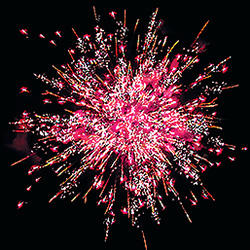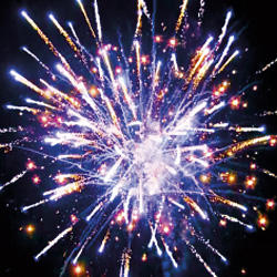 Веерная батарея. Разноцветные кометы разрываются букетиками из золотых форсов с синими огнями на концах, из падающих красных, зеленых, желтых, фиолетовых, синих огоньков. Форсовые и свистящие трассы разрываются маленькими белыми сферами. Разноцветные кометы разрываются сферами из красных огней и золотых форсов с мерцающими красными искрами. Золотые с трещащими искрами трассы, разноцветные кометы разрываются сферами из форсов, из шуршащих серебряных искр, красных и зеленых огней, золотых с трещащими искрами форсов, зеленых огней, форсов из шуршащих серебряных искр. Разноцветные кометы разрываются сферами из серебряных форсов, красных огней с серебряными форсами, зеленых огней с серебряными форсами, синих огней и золотых форсов. Золотые с серебряными мерцающими искрами трассы разрываются сферами из золотых форсов с серебряными мерцающими искрами, ярких серебряных огней с хлопком, трещащих огней.