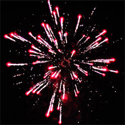 Разноцветные кометы разрываются сферами из: красных и зеленых мерцающих огней; зеленых и белых мерцающих огней; красных и золотых огней с треском; зеленых и золотых огней с треском; красных огней с форсами; зеленых мерцающих огней; синих огней и золотых форсов; зеленых огней с форсами; красных и трещащих огней; зеленых и трещащих огней; красных и мерцающих огней с треском; зеленых и мерцающих огней с треском. Красочная концовка.