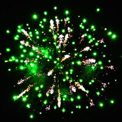 10. Выстреливает подряд: Красные звезды с пышными хвостами (кокос) и белое мерцание. Красные звезды с пышными хвостами (кокос) и треск. Зеленые звезды с пышными хвостами (кокос) и золотое мерцание. Зеленые звезды с пышными хвостами (кокос) и трещащий дождь. Серебряные звезды с пышными хвостами (кокос) и зеленые звезды. Серебряные звезды с пышными хвостами (кокос) и треск. Серебряные звезды с пышными хвостами (кокос) и красно-зелено-синяя сфера (пион). Красная сфера (пион) и облако трещащих разрывов (трещащая хризантема). Серебряные звезды с пышными хвостами (кокос) и зелено-фиолетовые звезды. Зеленые звезды с пышными хвостами (кокос) и облако трещащих разрывов (трещащая хризантема).
