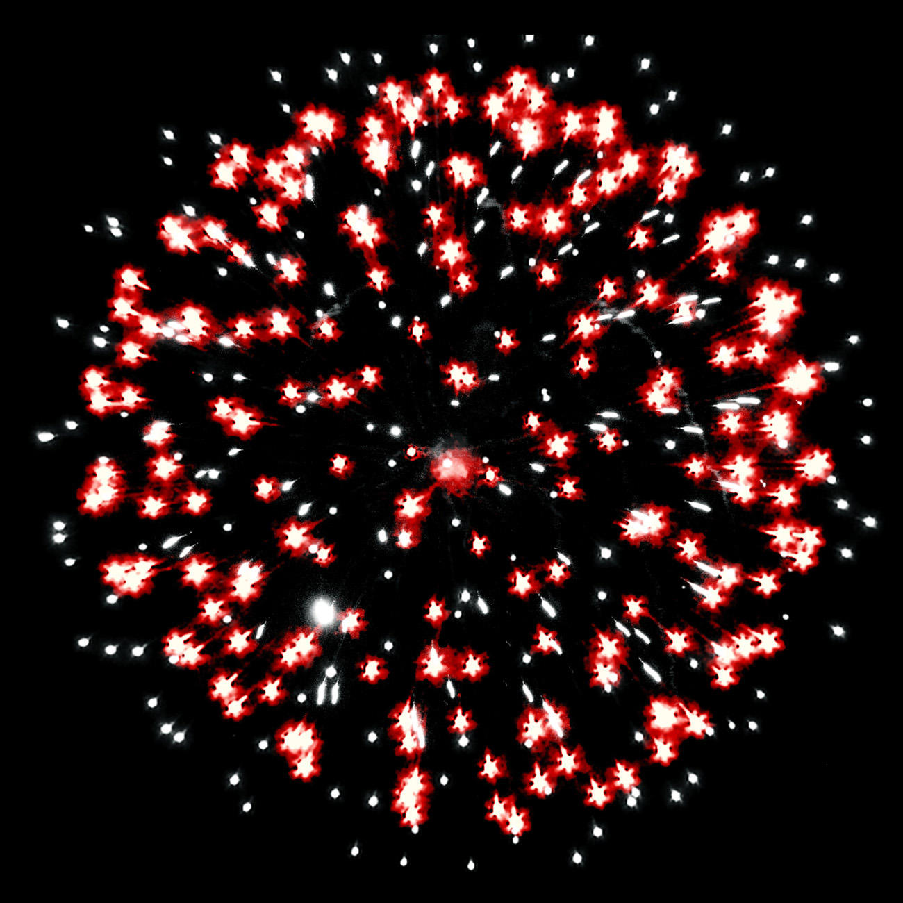 1. Красно-зеленая сфера (пион) и облако треска (трещащая хризантема).